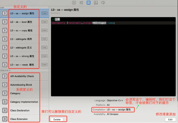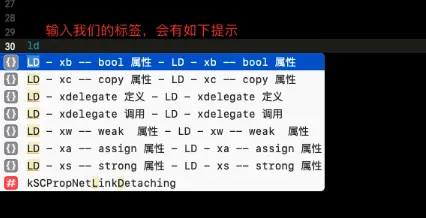 我们输入标签,就会有提示,比如说,我们输入ld ,会给我们一堆我们自定义的提示,比如我们选择delegate的定义