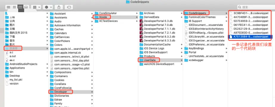 在我们设置代码块的时候,xcode会自动为我们生成相应的文件。而这文件是可以拷贝到我们新的电脑上的。这样我们换电脑也不用担心了。