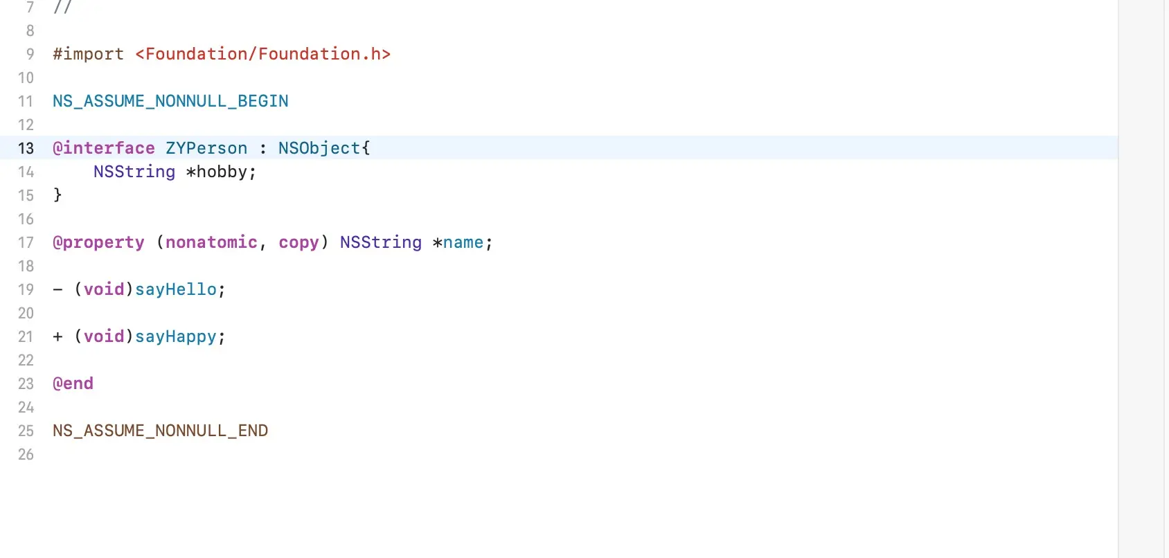 一般我们想看系统底层实现,一般有两个途径:第一是LLVM源码分析 第二个就是clang-rewrite-objc 进行底层编译,现在我们用第二种方式进行探究:首先我们先创建一个ZYPeople 类 里面有一些方法和属性以及实例变量: