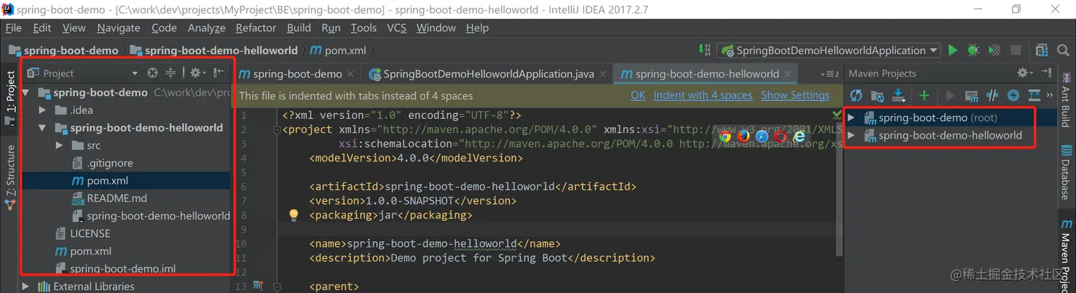 在spring-boot-demo-helloworld目录下,还有一个pom.xml,artifactId就是spring-boot-demo-helloworld,同时还配置了parent的相关属性,指定了父模块的artifactId,这样就组成了父子模块的关系。