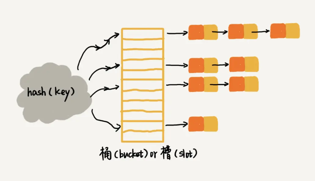 在散列表中,每个“桶(bucket)”或者“槽(slot)”会对应一条链表,所有散列值相同的元素我们都放到相同槽位对应的链表中。
