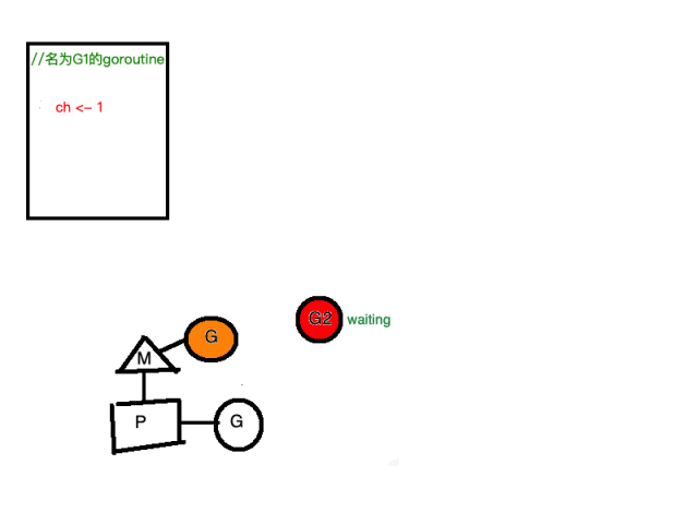此时恰好有个goroutine G1开始向channel中推送数据 ch<-1。此时,非常有意思的事情发生了: