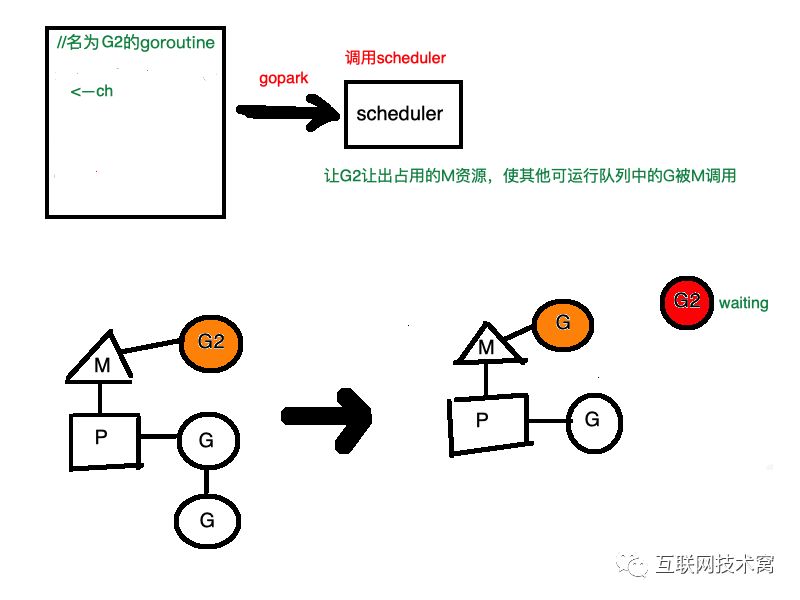 这个时候G2会主动调用Go的调度器,让G2等待,并从让出M,让其他G去使用。G2还会被抽象成含有G2指针和recv空元素的 sudog结构体保存到hchan的 recvq中等待被唤醒