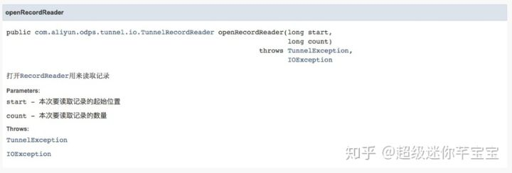 reader.close();这里通过了SQLTask提交了1条自定义select查询,然后使用InstanceTunnel.DownloadSession直接对该查询结果进行下载。其中,openRecordReader方法支持指定本次读取记录的起始位置和读取数量,通过openRecordReader(start,long)的参数设定,可实现分批下载的逻辑。
