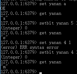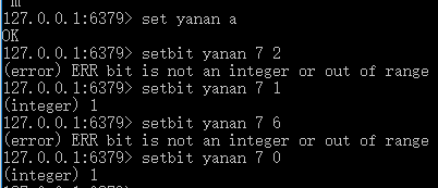 .setBit(key, offset, value):key键对应的值value对应的ascii码,在offset的位置(从左向右数)变为value.(此处感谢@参考文章对我理解的帮助),由于二进制只有0和1,此处value只能取0和1,如图,其他值是超出范围的