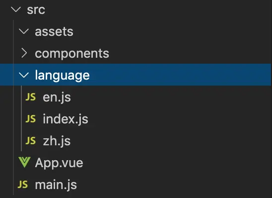 language用来维护翻译的语言包,其中index.js export 出来一个i18n对象,在最外面的main.js(初始化vue的地方),将i18n挂在到vue实例上。