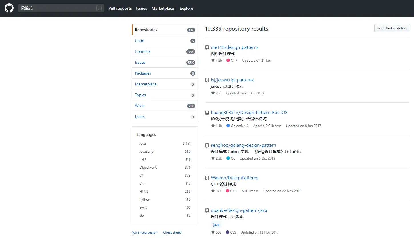 但是基于 ElasticSearch 的 Github,比如我们搜索“设模式”,搜索结果也会出现“设计模式”: