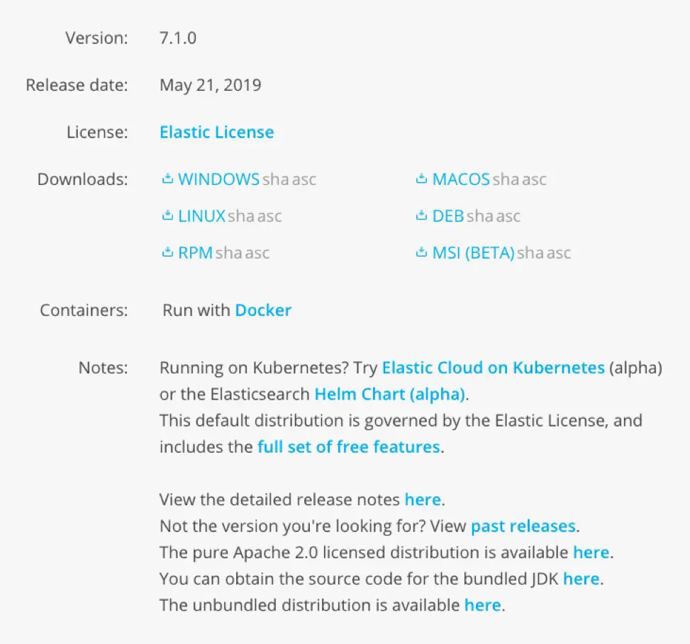 打开官网后根据自己的系统选择对应文件,因为我用的是 Windows 环境,所以下载 ElasticSearch-7.1.0-windows-x86_64.zip 版本,下载完成后解压即可。