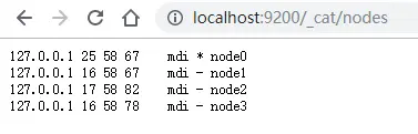 在浏览器访问 http://localhost:9200/_cat/nodes ,可以查看集群存在哪里节点。