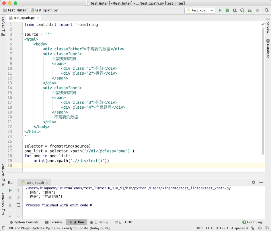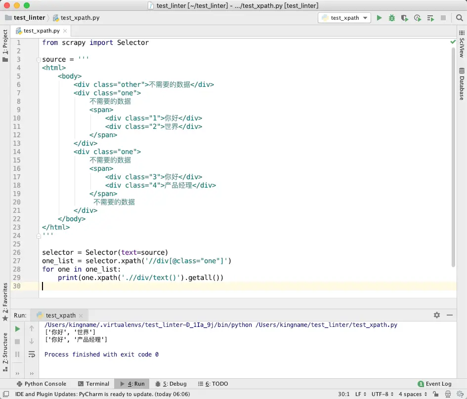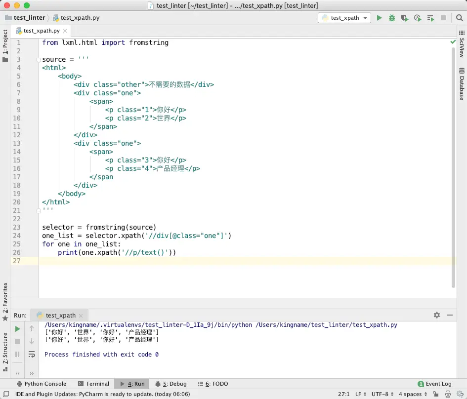 如果我们使用 lxml 来提取里面的你好、世界、你好、产品经理。