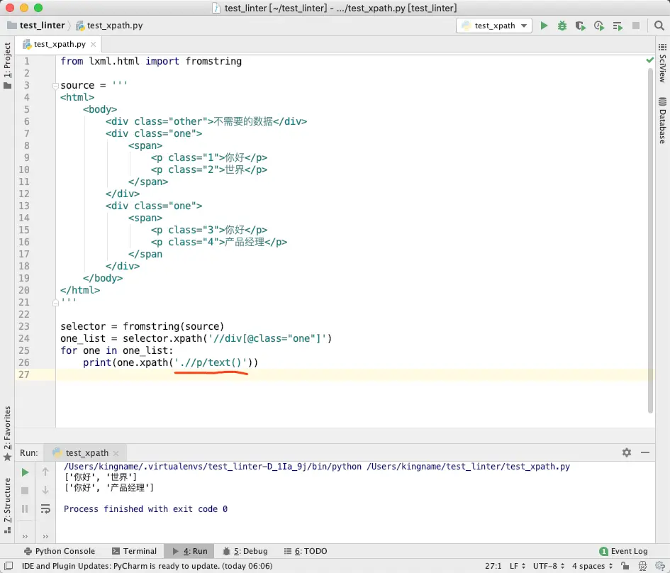在PyCharm 的调试模式中,单步执行代码到第264行,使得 elements 列表生成完成。然后我们继续在Evaluate Expression窗口中执行Python 语句:elements[0].xpath('//p/text()'),通过调用 Element 对象的.xpath,我们发现,竟然已经实现了混用.//与//了。如下图所示:
