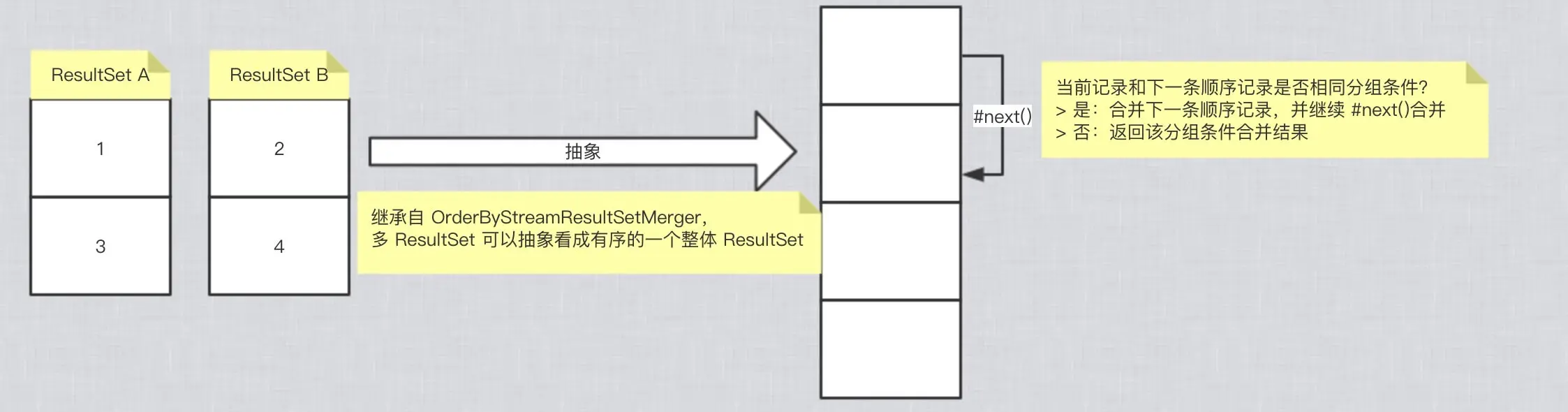 - Stream 流式:将数据游标与结果集的游标保持一致,顺序的从结果集中一条条的获取正确的数据。看完下文第三节 OrderByStreamResultSetMerger 可以形象的理解。