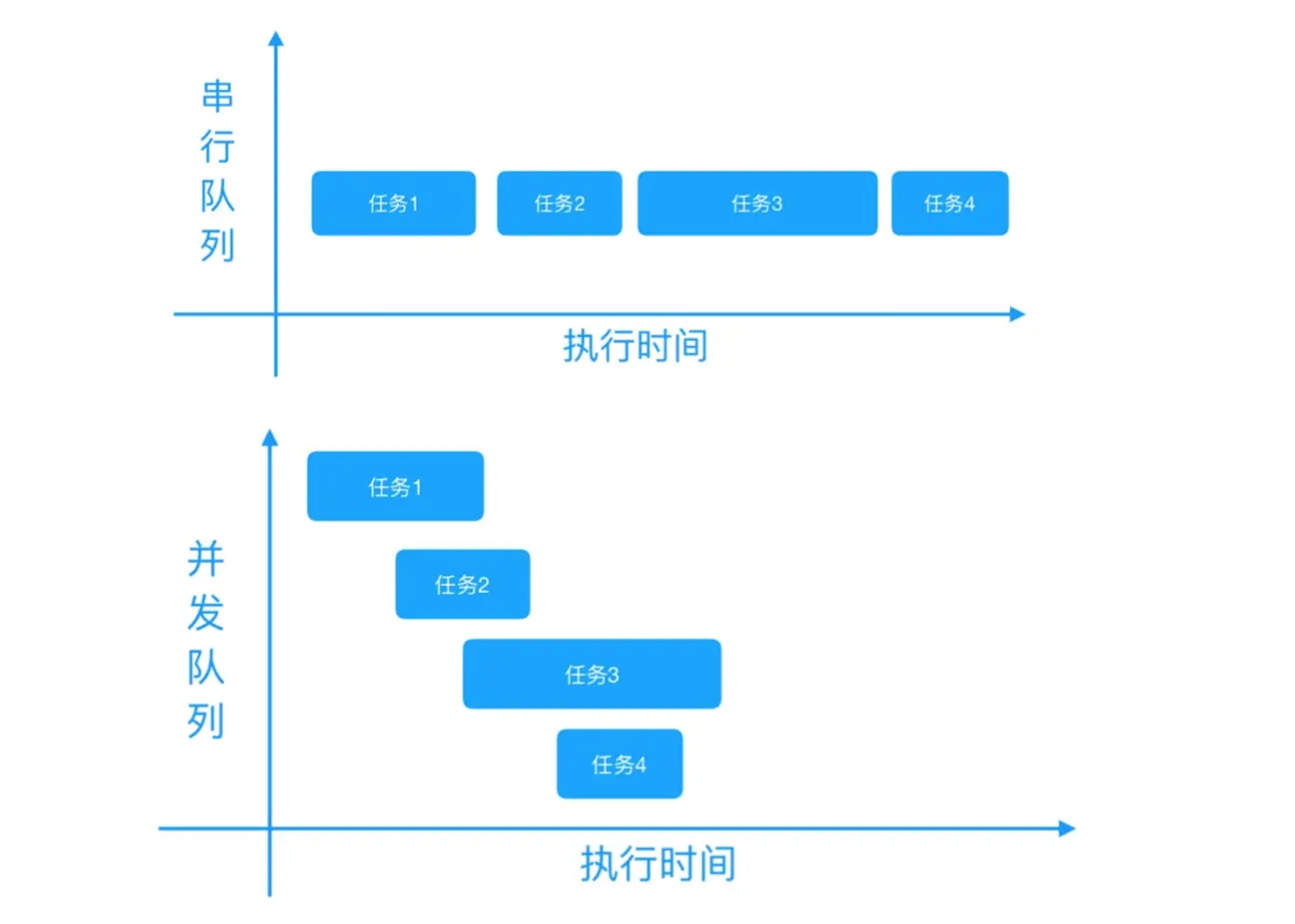 (Serial Dispatch Queue): 每次只有一个任务被执行。让任务一个接着一个地执行。(只开启一个线程,一个任务执行完毕后,再执行下一个任务) - 并发队列