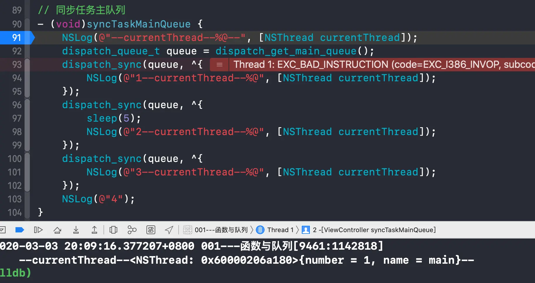 我们发现程序在第一个同步任务的地方崩溃了,这是因为此处发生了死锁。那是因为我们在主线程中执行syncTaskMainQueue方法,即把syncTaskMainQueue任务放到了主队列中。当我们把“打印1”这个同步任务追加到主队列中,“打印1”需要等待syncTaskMainQueue的执行,而syncTaskMainQueue需要等待“打印1”执行完毕,才能接着执行。这就形成了死锁。
