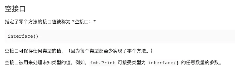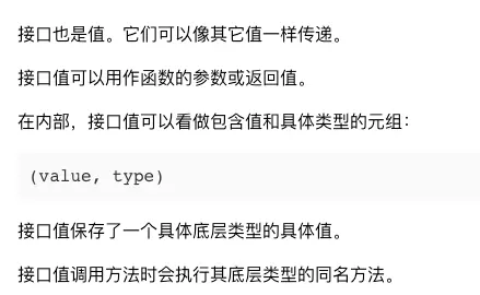 - 接口类型 是由一组方法签名定义的集合。
