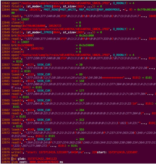 根据以上的信息快速排查3个结论,基本上可以判断出: Pytorch在读UFS数据过程中,文件读取逻辑或者UFS存储IO耗时导致。于是我们通过strace观察Pytorch读取数据整体流程: