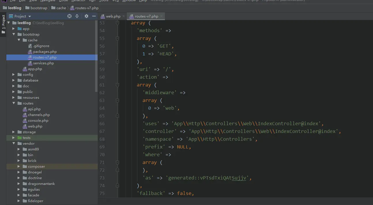 找到我们项目中bootstrap/cache/routes-v7.php,这个就是我们的路由缓存文件,如果存在,laravel就不会重新解析路由,直接拿到这个解析后的路由进行相应,从而提升网站访问速度。