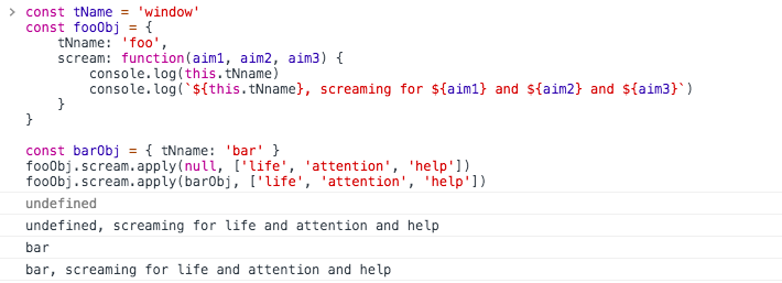 fooObj.scream.apply(barObj, ['life', 'attention', 'help'])