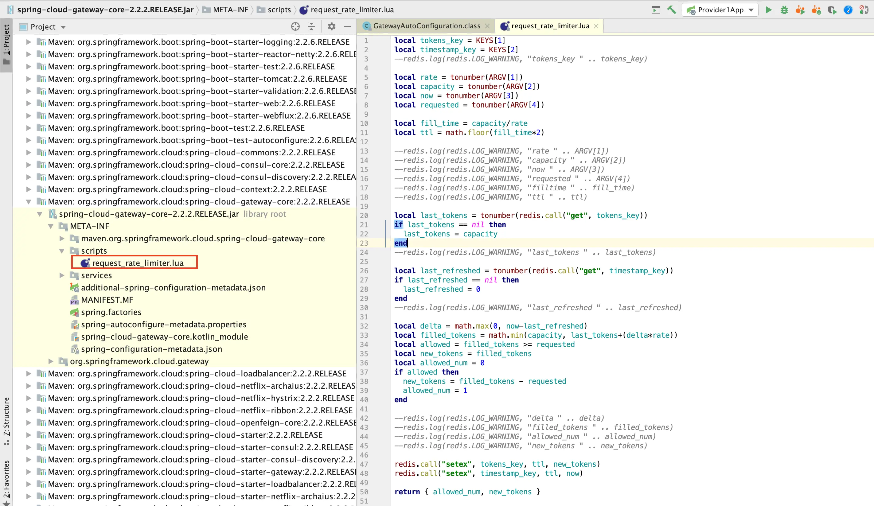 在 Spring Cloud Gateway 中,有 Filter过滤器,因此可以在 pre 类型的 Filter 中自行实现上述三种过滤器。但是限流作为网关最基本的功能,Spring Cloud Gateway 官方就提供了 RequestRateLimiterGatewayFilterFactory 这个类,适用在 Redis 内的通过执行 Lua 脚本实现了令牌桶的方式。具体实现逻辑在 RequestRateLimiterGatewayFilterFactory 类中,lua 脚本在如下图所示的文件夹中: