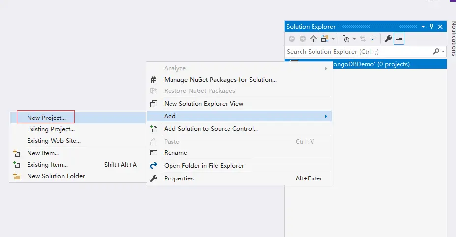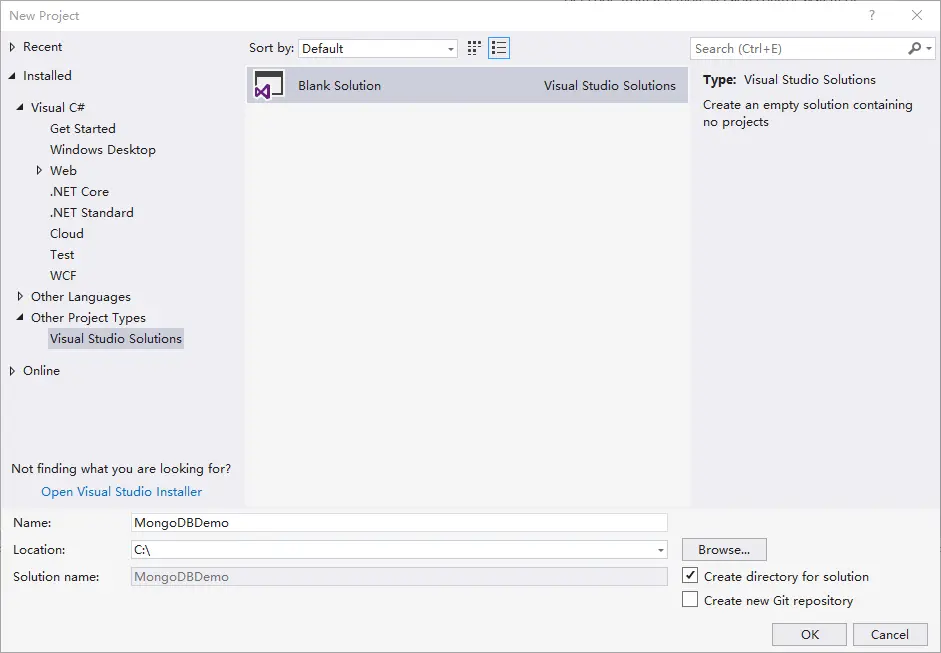 新建空白解决方案,名称为MongoDBDemo,保存在C盘根目录。