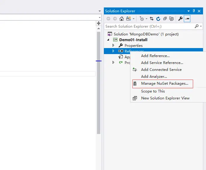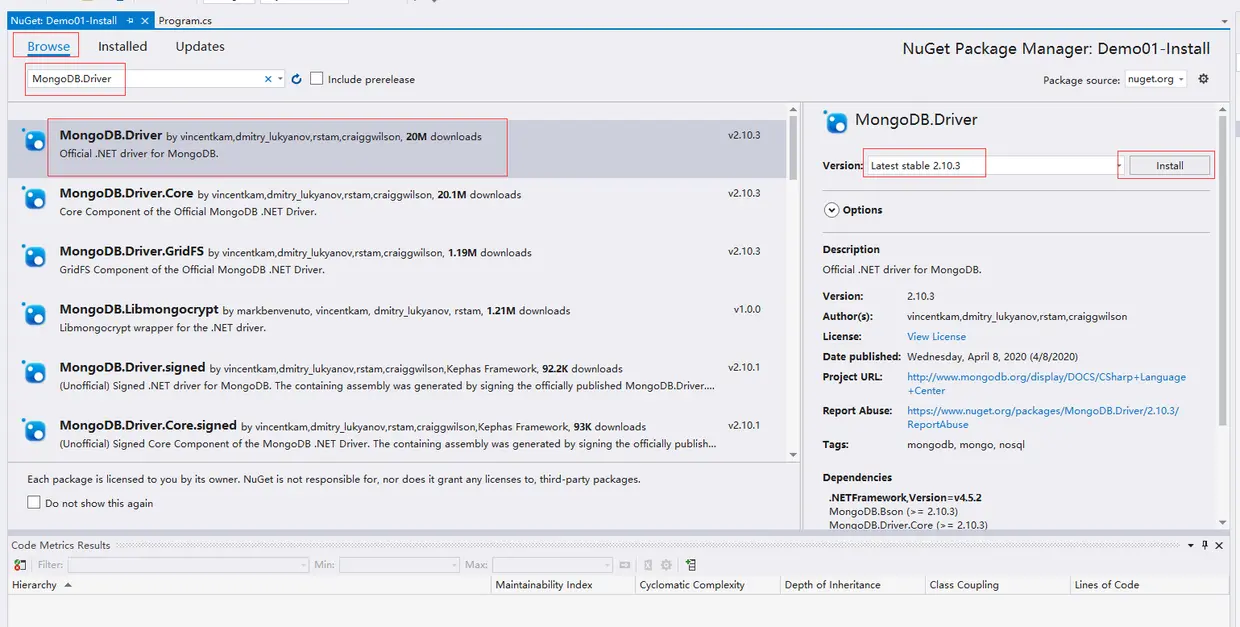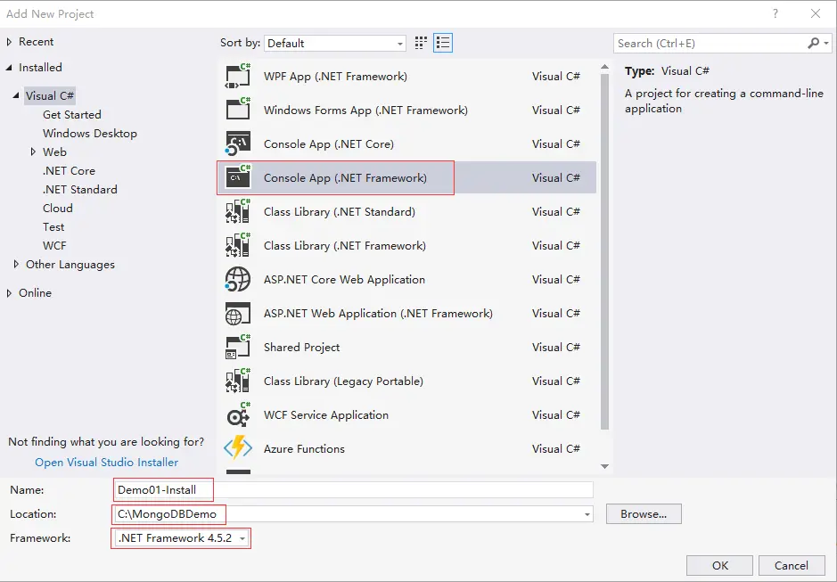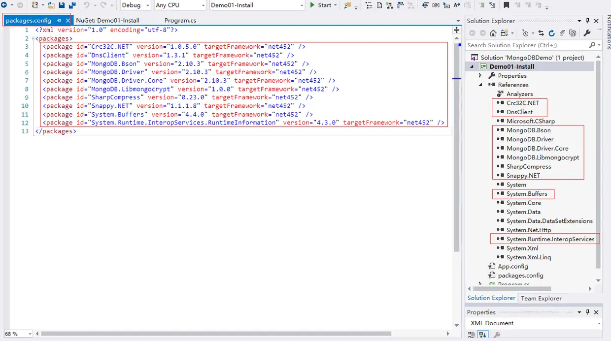 本教程使用的MongoDB实例运行在Windows 10 64位的系统上,版本是4.2.2。开发环境是Visual Studio 2017,.NET Framework版本是4.5.2,.NET驱动版本是2.10.3。为了简化操作,MongoDB实例和开发环境运行在同一台电脑,建议使用前面描述相同的配置,这样能保证程序例子运行的结果一致。
