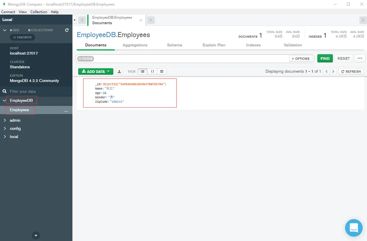 MongoDB实例生成了数据库EmployeeDB和集合Employees,并且在集合Employees里面插入了一个文档。至此,开发环境准备完毕。