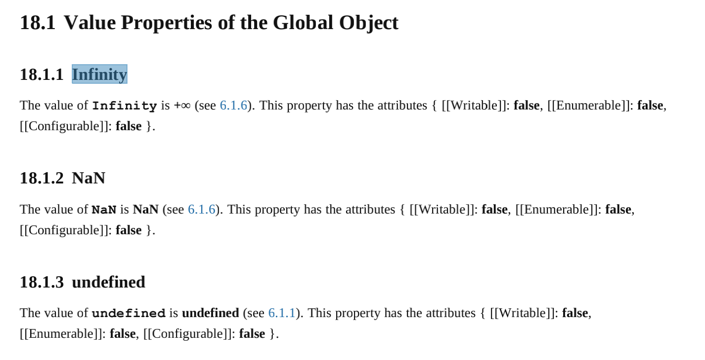 这里可以看到 其实 Infinity, NaN, undefined 是所谓全局对象的属性 额外定义的。