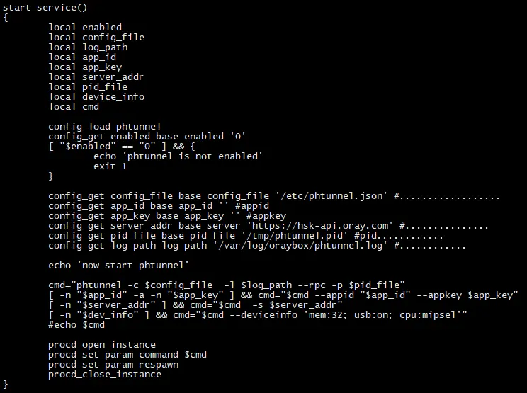 启动脚本用于启动与停止phtunnel,启动后读取uci配置,变成phtunnel的启动参数,然后启动phtunnel程序,代码如下: