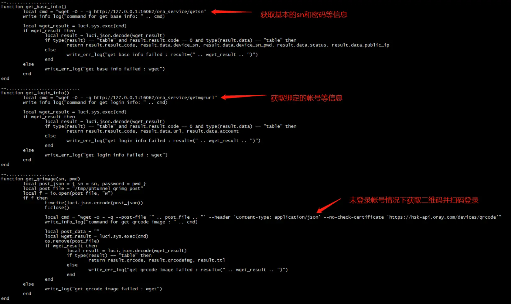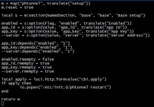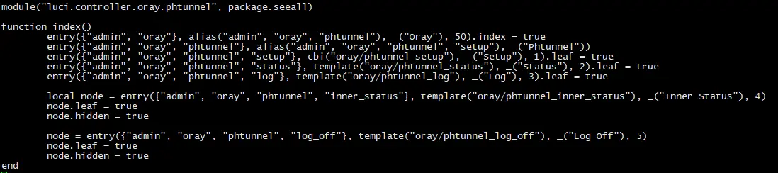 luci的代码区域在/usr/lib/lua/luci中,所以所有交互的web代码都放在这个下面,首先是核心的基础库phtunnel.lua,它将提供所有核心函数,如获取二维码,登录信息和解绑操等核心功能。