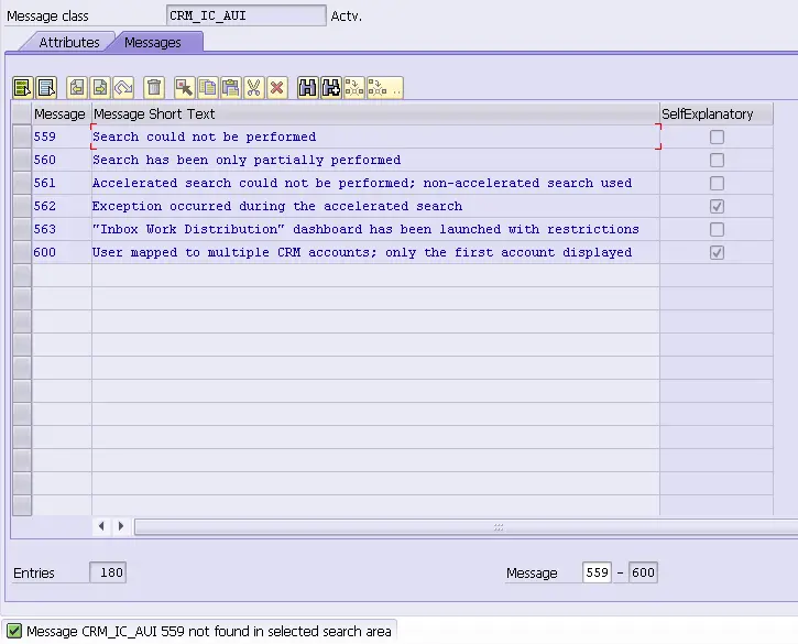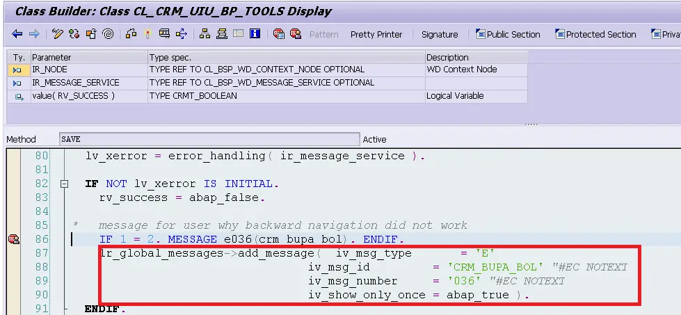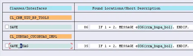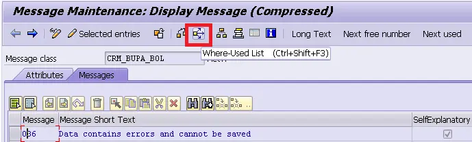 Now we know the message id is CRM_BUPA_BOL and number is 036. Go to transaction code SE91 and search code via where use list: