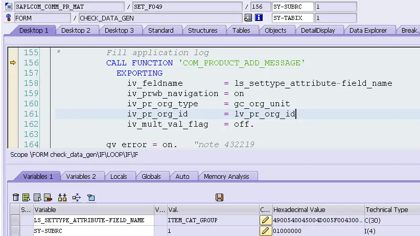 - When it comes to product area, it is pretty easy to find the source code of given message. Almost all underlying messages in product application is raised by utility function module COM_PRODUCT_ADD_MESSAGE. In example below I input an invalid item category group WWW and would like to find which code does validation check and raise error message. All I have to do is just to set a breakpoint in that function module, and re-save in UI: