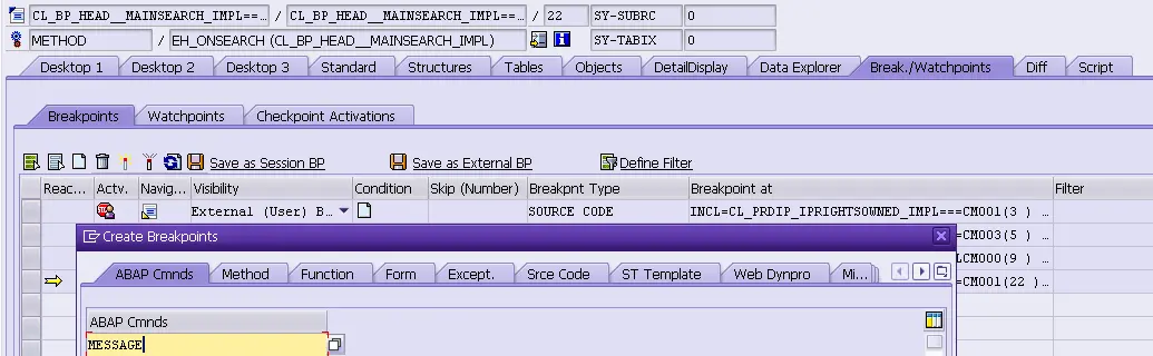 The breakpoint is hit when I click search again. However I will not debug it line by line. Click tab “Break./Watchpoints”, and create a dynamic breakpoint for ABAP command MESSAGE. As a result the breakpoint will be triggered wherever the keyword MESSAGE is written in ABAP code.