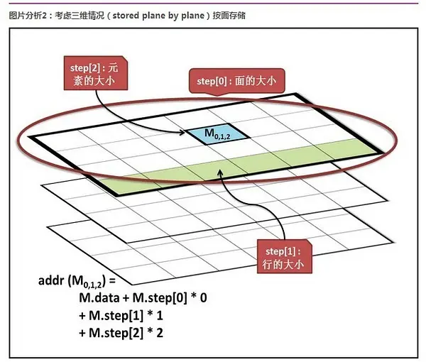 step:是一个数组,定义了矩阵的布局,具体见下面图片分析,另外注意 step1 (step / elemSize1),M.step[m-1] 总是等于 elemSize,M.step1(m-1)总是等于 channels;