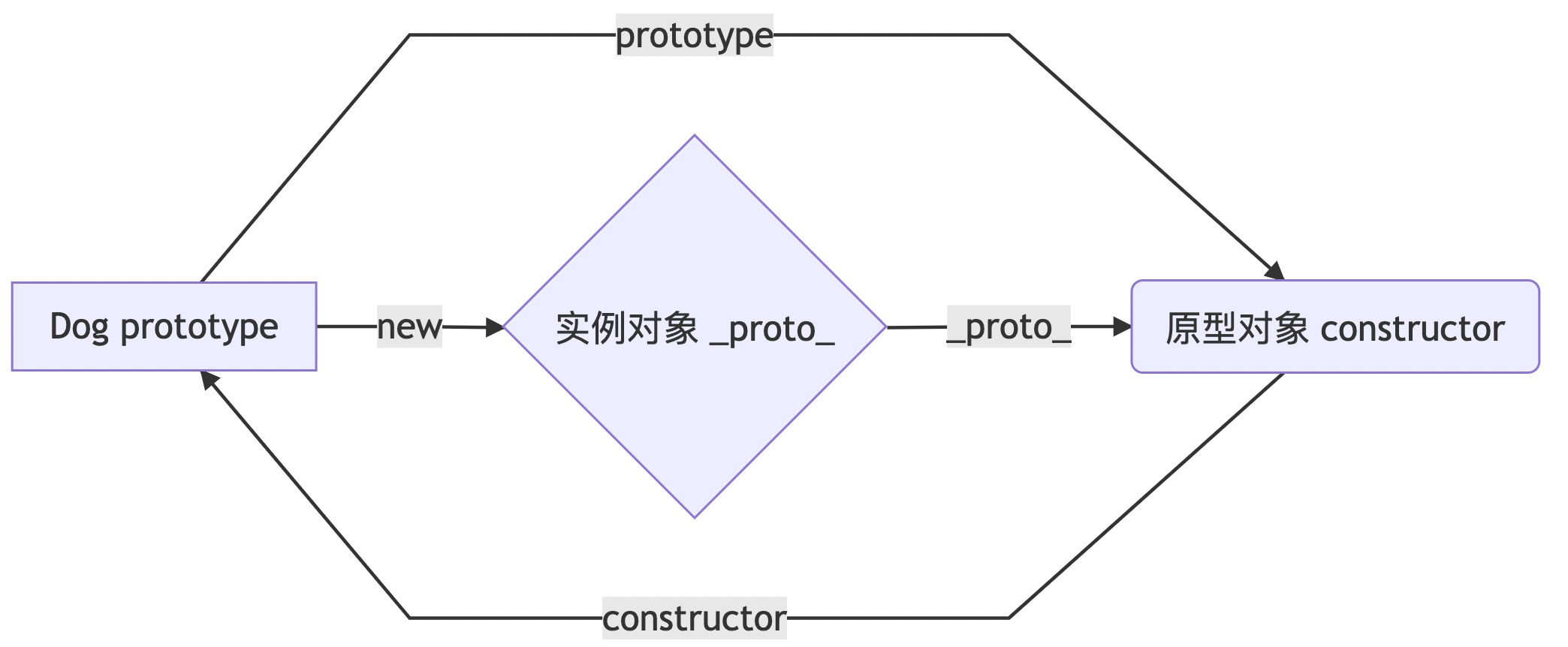 构造函数、构造函数的原型对象和实例对象三个实体之间的关系。 构造函数有prototype属性指向原型对象,原型对象的constructor属性指向构造函数,通过构造函数new的实例对象有_proto_属性指向原型对象。