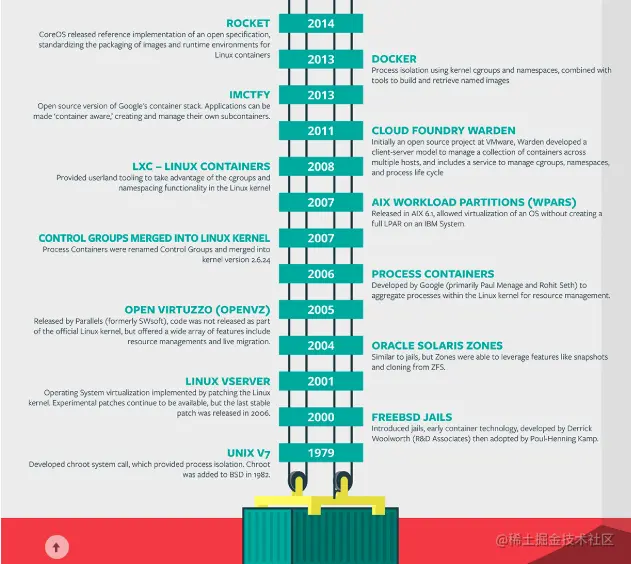 基于需求刺激,容器技术应运而生。容器的发展从 Chroot,FreeBSD jails,OpenVZ,LXC,到如今的 Docker、Rocket 真正走向了大规模应用。
