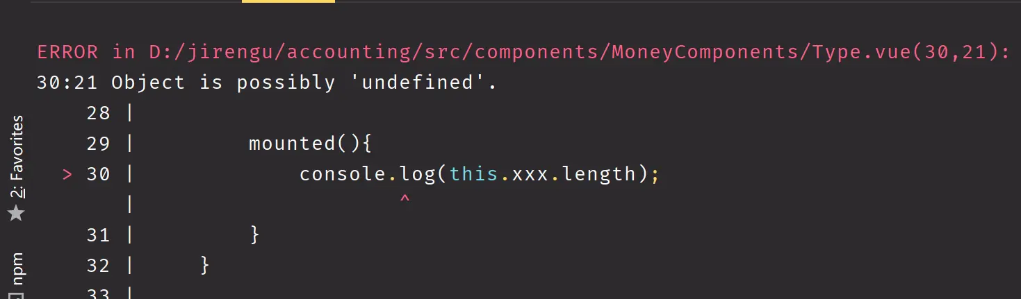 如果我对这个xxx进行一些奇怪的操作,比如:console.log(this.xxx.yyy); 那么我在保存代码的时候会在终端报错,但是浏览器那边是没有报错的。这就是编译时发生了错误。因为写的是number | undefined,但是number和undefined都没有一个.yyy的方法或属性。
