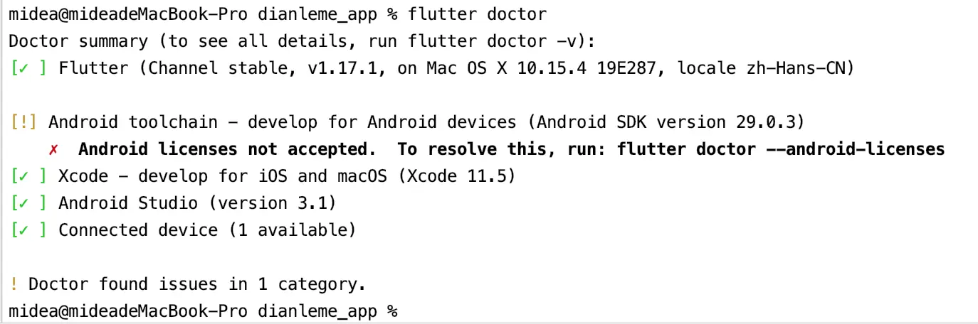 若是有什么需要安装的,则按照flutter doctor这个执行结果提示去安装或者下载一下;