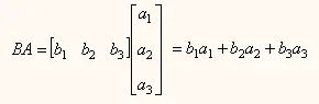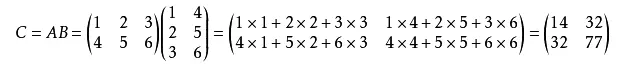 这是一个一行三列的矩阵与三行一列的矩阵相乘的过程。可以理解为最后得到一个一行一列的矩阵。需要注意的是如果A和B的位置互换,那么结果是完全不一样的,得到的会是一个三行三列的矩阵。也就是说矩阵的乘法是没有交换律的。如果A和B的位置交换,那么得到的会是这样的: