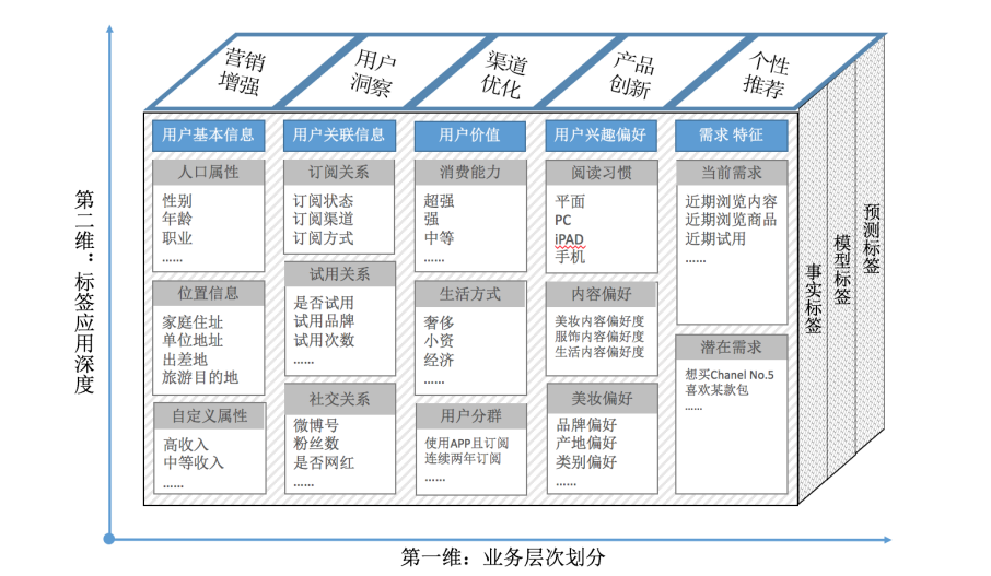 用户画像体系和标签分类从两个不同角度来梳理标签,用户画像体系偏战略和应用,标签分类偏管理和技术实现侧。