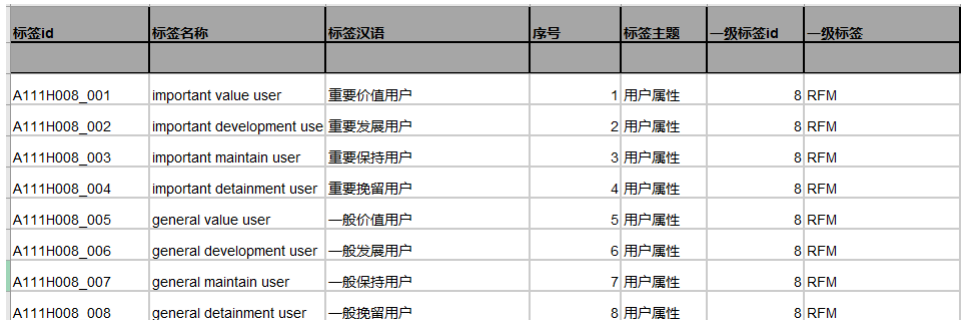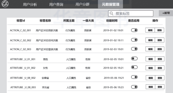 对于用户是男是女这个标签,标签主题是用户属性,标签类型属于分类型,开发方式为统计型,为互斥关系,用户 维度为userid。这样给男性用户打上标签“A111U001_001”,女性用户打上标签“A111U001_002”,其中 “A111U”为上面介绍的命名方式,“001”为一级标签的id,后面对于用户属性维度的其他一级标签可用“002”、 “003”等方式追加命名,“_”后面的“001”和“002”为该一级标签下的标签明细,如果是划分高、中、低活跃 用户的,对应一级标签下的明细可划分为“001”、“002”、“003”。
