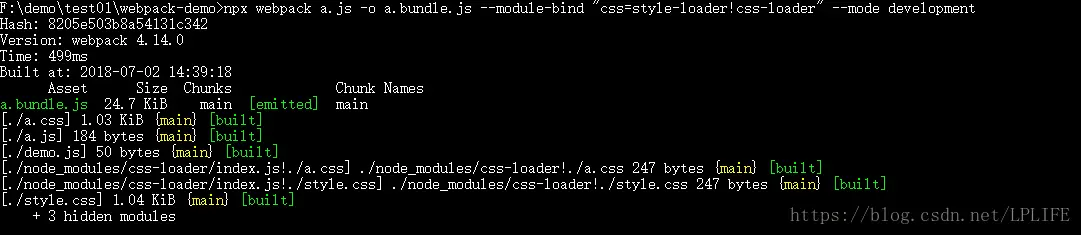 npx webpack a.js -o a.bundle.js --module-bind "css=style-loader!css-loader" --mode development- 注意: 是双引号.不是单引号...