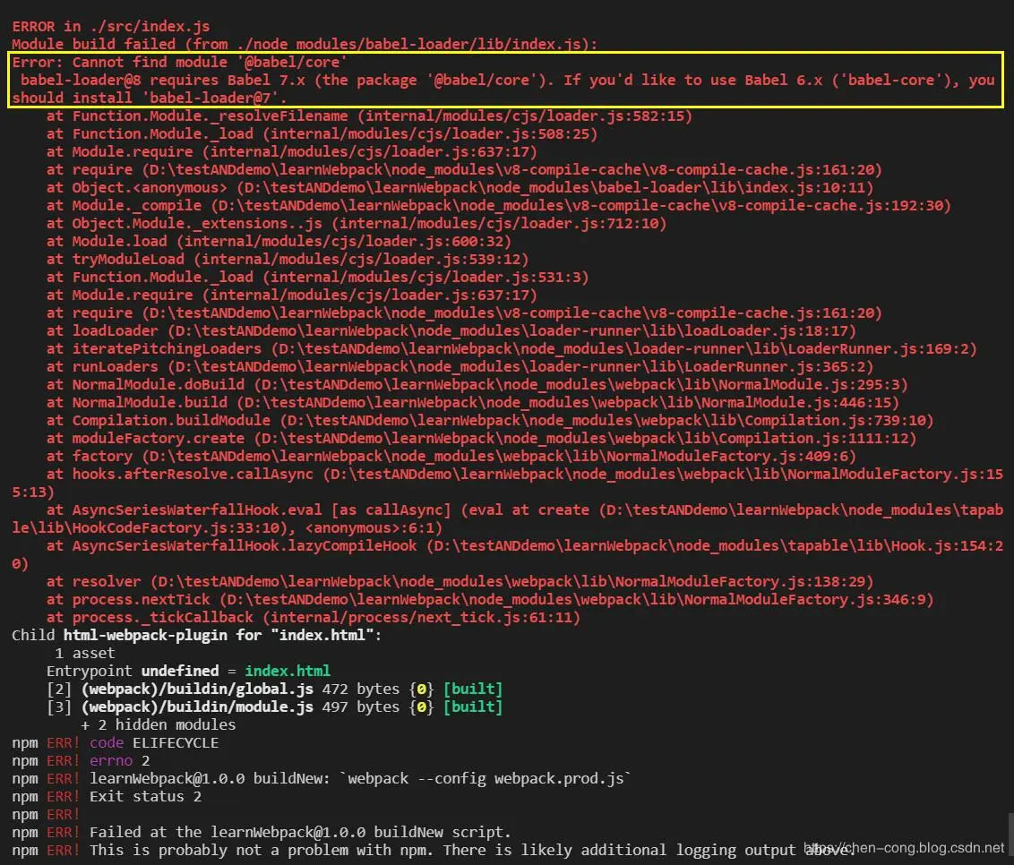 npm run build,如果出现了以下错误(babel相关的错误): 这个错误日志指出了原因:找不到'@babel/core',再按照错误提示的操作说明可以知道:babel-loader@8 需要 Babel 7(里面的包'@babel/core'),如果你想要使用 Babel 6.x版本,你应该安装'babel-loader@7'。在package.json文件中可以看到我们安装的版本: