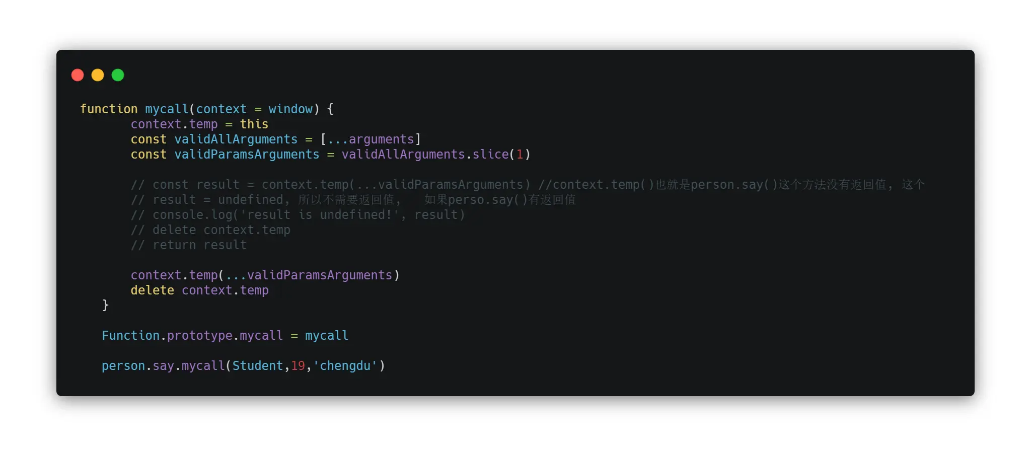 person.say.mycall(Student,19,'chengdu') 所以这个this 是 person.say 这个对象