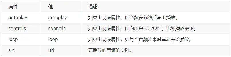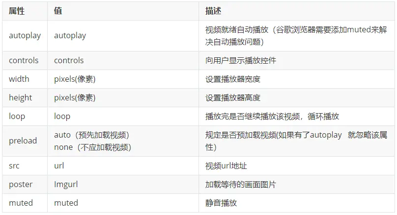 - 视频标签是重点,我们经常设置自动播放,不使用 controls 控件,循环和设置大小属性