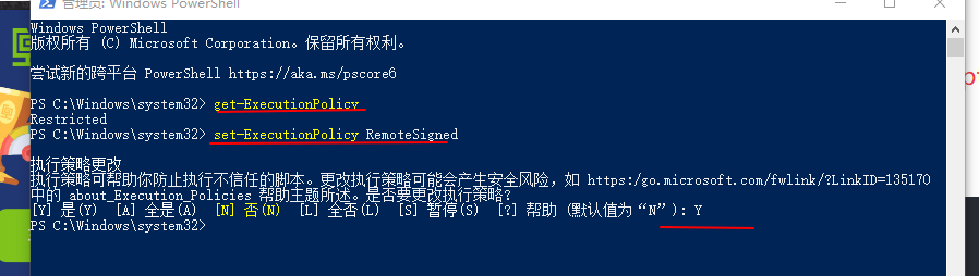 3.执行:set-ExecutionPolicy RemoteSigned