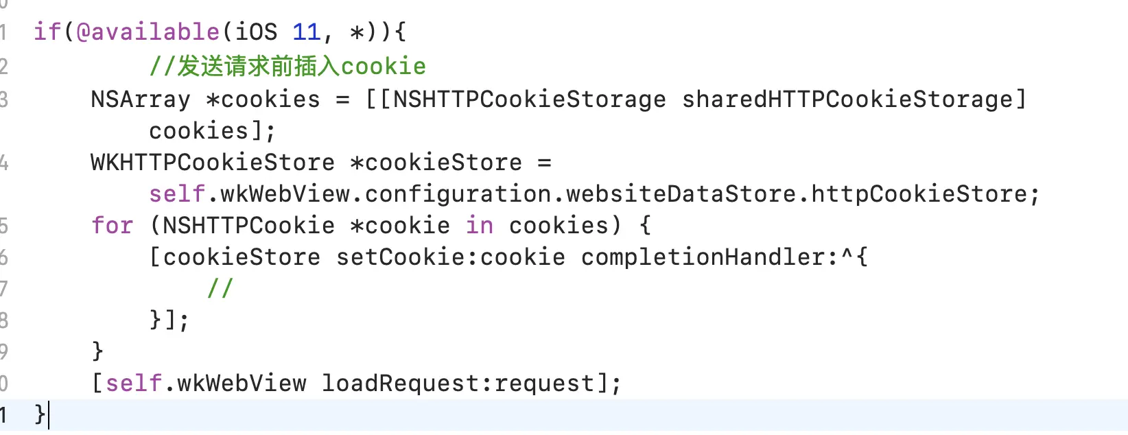 利用iOS11 API WKHTTPCookieStore 解决 WKWebView 首次请求不携带 Cookie 的问题;这是因为:WKWebView每次请求都会携带 WKHTTPCookieStore 里的 Cookie。(WKWebView 使用 NSURLProtocol 拦截请求无法获取 Cookie 信息) 在执行 [WKWebView loadRequest:] 前将 NSHTTPCookieStorage中的Cookie信息复制到 WKHTTPCookieStore 中,以此来达到 WKWebView中注入Cookie 的目的