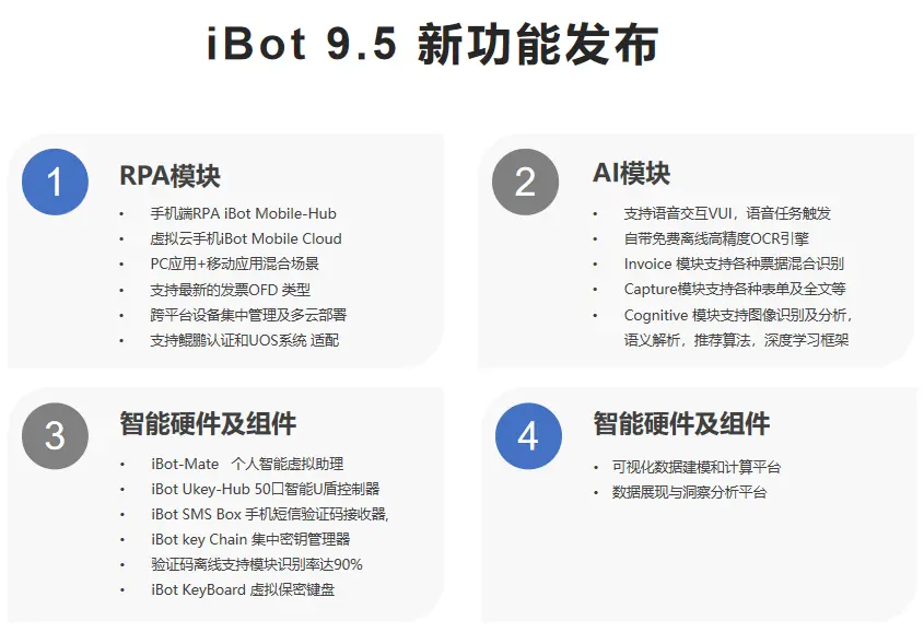 iBot是数字化生产力平台,新版本iBot9.5。在原有的基础上新增了Opers和智能硬件组件等黑科技,为用户提供了更广泛的应用范围和更友好的用户体验,极大程度提升了iBot的易用性。