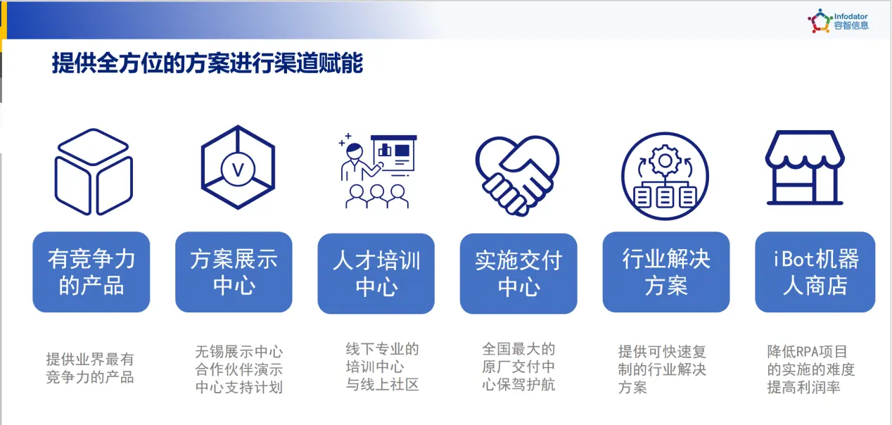 通过会议上新产品的重磅发布以及容智对合作伙伴的支持政策,让合作伙伴看到了容智iBot已经在产品和技术方面遥遥领先,且是以最大诚意最强的支持力度支持合作伙伴相关拓展业务的厂商。让合作伙伴对未来的规划认识更加清晰,也更有信心了,坚信容智可以为企业和合作伙伴创造出一个共赢的局面,让合作伙伴享受到能力增值带来的收益,更加从容地面对企业客户数字化转型挑战。