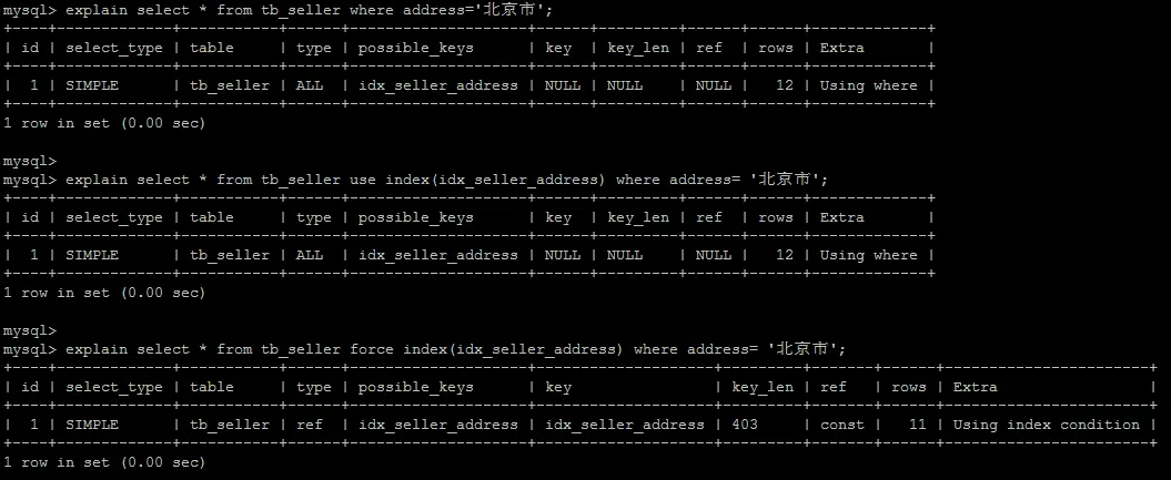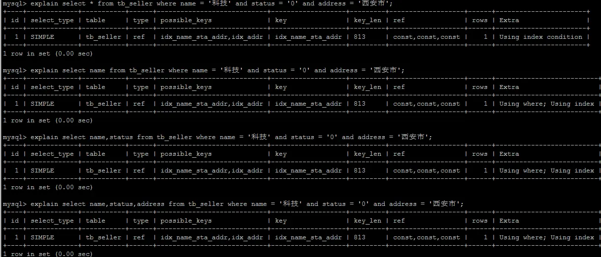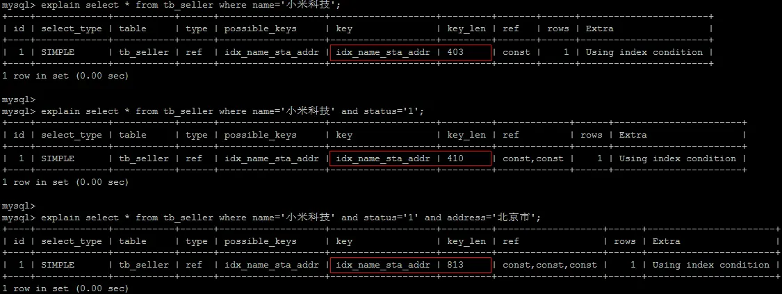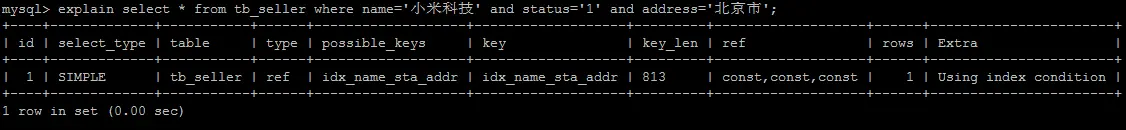 explain select * from tb_seller where name='小米科技' and status='1' and address='北京市';