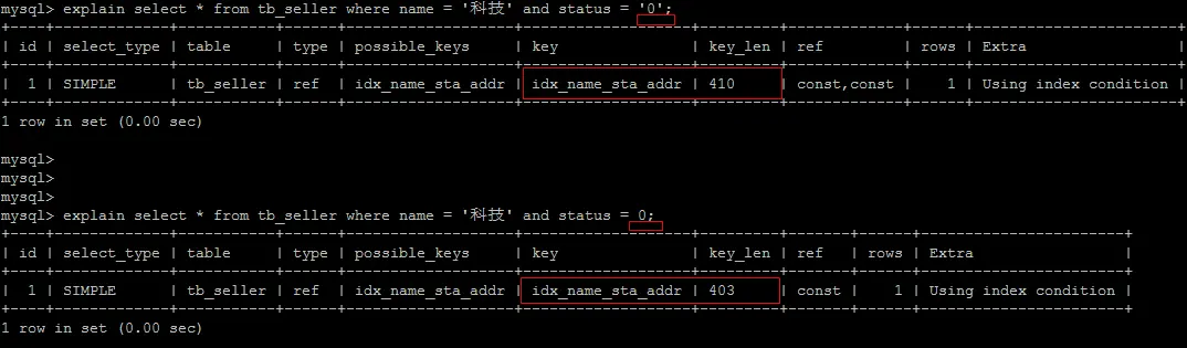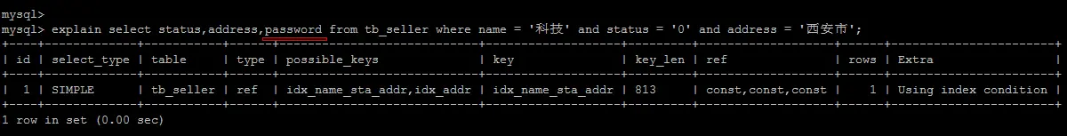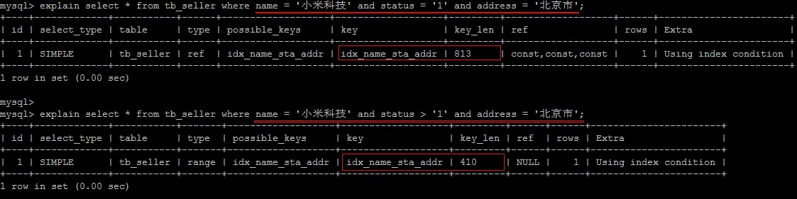 根据前面的两个字段name , status 查询是走索引的, 但是最后一个条件address 没有用到索引。
